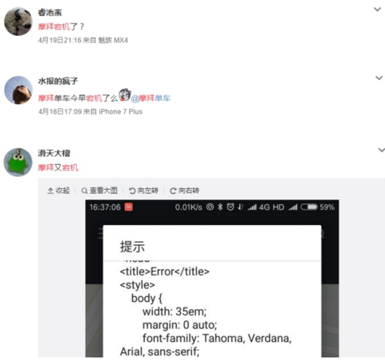 微博用户“邬尔夫“也反映,4月19日摩拜app扫码频繁出错。”最近晚上下班无法使用摩拜,iPhone打开软件后看不到周边车辆分布,扫码无响应,初步推断网络连接问题“。业内人士认为,摩拜自从上线所谓的”人工智能平台“后,对外界常常夸耀其技术实力,言必称专利研发能力强。但时至今日,连小小的宕机问题都解决不了,”明显是狠狠扇了自己一记耳光“。