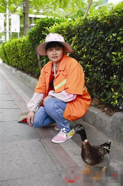 她收养了一只鸭子,每天陪着她扫大街,鸭子寸步不离萌翻路人;她帮助过许多流浪人员,曾多次自掏腰包给宏远桥下的流浪人员买水买早餐;她收留过一个流浪女孩,供她吃住了一周还帮她找过一份工作。