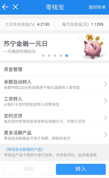 此次,苏宁零钱宝推出了工资定时转入和定时还贷的功能。工资定时转入功能主要针对上班族,他们时常忘记躺在银行卡上的工资,相比较低的银行卡活期收益,苏宁零钱宝的收益要高些。(截至4月28日,预期7天年化收益率为4.213%);定时还贷功能主要针对需要定期偿还车贷、房贷等贷款的用户,以防用户忘记还款而影响个人信用。