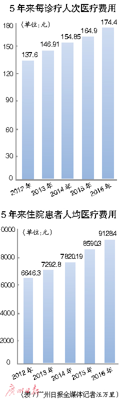 与2015年每诊疗人次医疗费用164.9元相比,去年东莞每诊疗人次医疗费用上涨了9.5元;而在住院患者人均医疗费用上,2015年是8590.3元,2016年上涨了538.1元。实际上,这两个数据几乎每年都在缓慢地上涨。