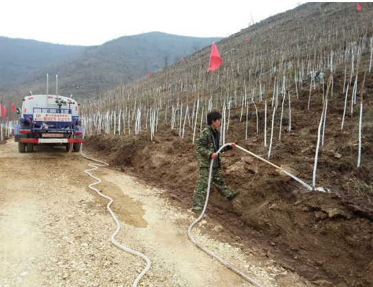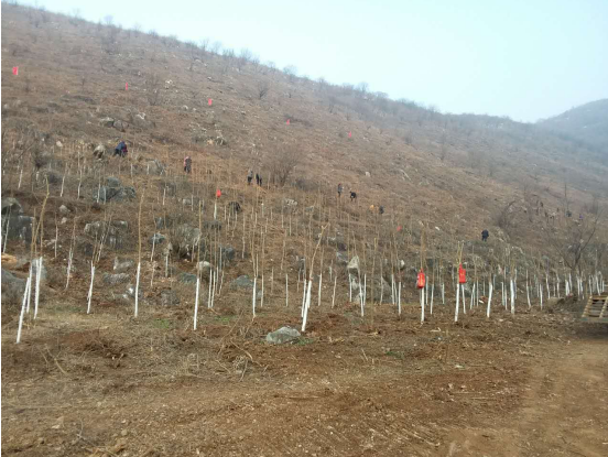 该公司响应国家石漠化治理和桐柏县淮河源头生态建设号召,创新机制,流转桐柏县淮源镇大栗树村集体石漠化荒山2400亩,远期规划流转5000亩,重点开展石漠化治理造林,推进淮河源头生态建设,为带动当地精准扶贫助力。该基地位于桐柏县淮源镇大栗树村境内,立地条件差,土层瘠薄,植被覆盖率低,属于典型的山区石漠化造林困难地。公司在各级政府及林业部门的指导下,自2016年7月份以来,邀请林业工程技术人员从规划布局、作业设计、技术方案、树种选择、整地规格、日常管护等方面按高标准、严要求,规范操作,保证造林质量。施工作业采用机械挖坑、投放熟土、客土造林、合理修剪、保证苗木根系完整、根部蘸浆以及浇水保苗、培土抚育保墒等工程措施相结合的方法,有效地提高了困难地的苗木造林成活率,确保造林质量。