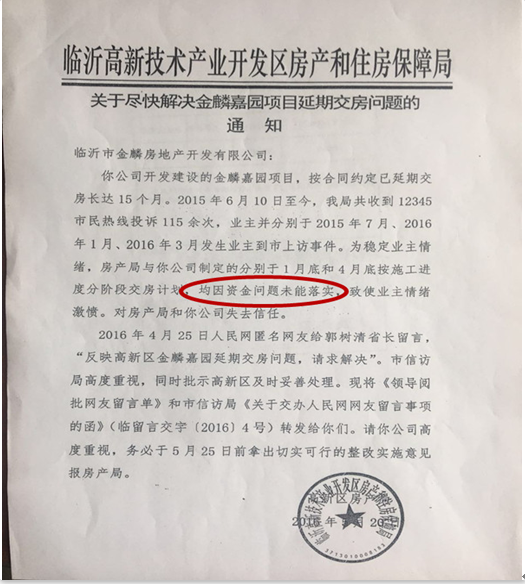 (房管局的通知显示:临沂金麟房地产开发公司在施工过程中资金出现问题)