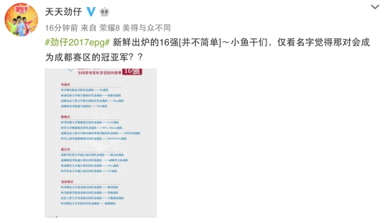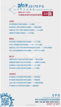 5月10日,劲仔通过官方微博@天天劲仔,正式公布此次2017 EPG劲仔全国游戏爱好者竞技问鼎赛预选赛(后文简称劲仔EPG预选赛)选拔结果。并且发出了入围劲仔EPG预选赛16强战队的海报宣传图。