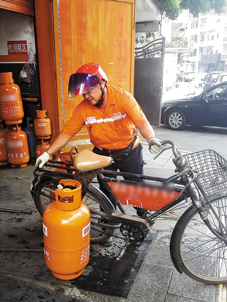 每天早上7时许,刘正兵就上班了。一部旧单车,两瓶液化气,刘正兵从气站领到煤气瓶后就开始了一天的工作。“最高纪录是一天送了79个大瓶”,刘正兵是公司内部出了名的“送气王”,送瓶数日均50瓶。