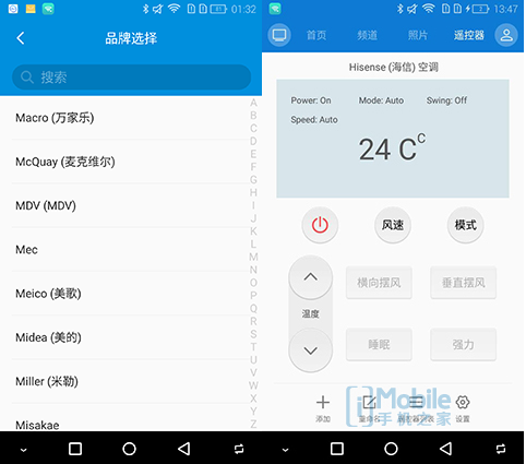 在遥控器列表中我们可以添加多个遥控器分别控制,首先我们需要先添加设备,在空调品牌中找到“海信”,然后把手机对准空调进行适配。大概10秒钟所有即可完成,整体功能基本是我们可以用到的,模式、风俗、睡眠、温度等等。