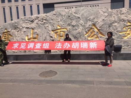 2017年5月13日上午10时许,被胡瑞新非法抓捕的七名无辜保安家属携带横幅标语,上书“求见调查组,法办胡瑞新”字样,来到唐山市公安局,要求面见调查组陈情,无罪释放受害人,法办胡瑞新,但被门卫以周末不上班为由挡在门外。