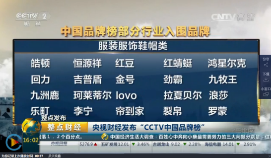 5月10日是我国首个“中国品牌日”,央视财经联合国家发改委、国家工商总局、国家质检总局等部委,在京举行“CCTV中国品牌榜”启动仪式,公布首批“CCTV中国品牌榜”入围名单。皓顿HAUTTON成为首批入围“CCTV中国品牌榜”的服装服饰鞋帽类品牌。