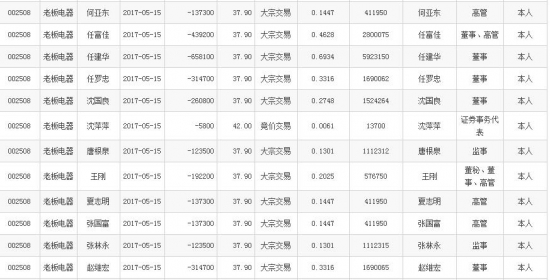 继美的电器被实控人减持套现逾11亿元后,家电行业又一白马蓝筹股遭内部人员大批量减持。深交所网站5月16日数据显示,5月15日,老板电器(42.760, 0.65, 1.54%)12位董监高管以大宗交易合计减持股份2,844,400股,大部分成交价格在37.90元/股,据此计算该部分股票市值约1.078亿元。