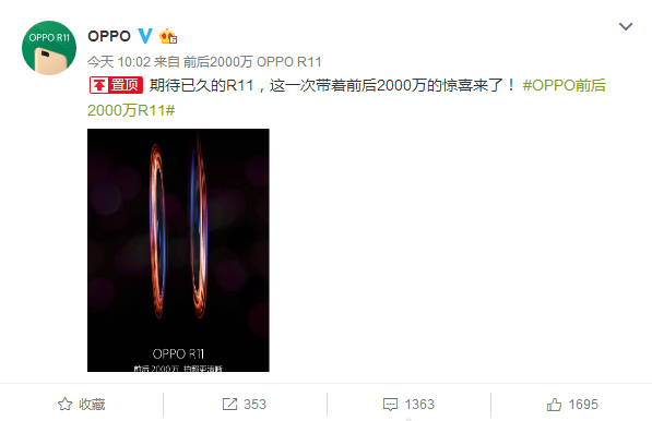 昨晚,OPPO新品R11出现在全国9大城市地标上,大家纷纷猜测OPPO R11要来了。而今天,OPPO官方又发出新品R11即将发布的新消息,证实这一猜测,其中宣传语呼应了上一款R9s的“这一刻,更清晰”,更新为“前后2000万,拍照更清晰”,表明了OPPO R11的前后摄像头均为2000万。同时,R11将是OPPO首款使用双摄像头结构的手机。