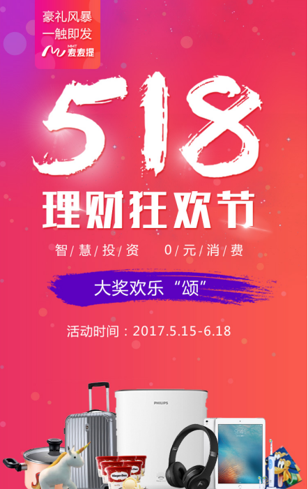 2017年5月15日,麦麦提金融518理财节活动正式拉开帷幕!活动期间,抵现券、加湿器、迪士尼双人游门票及ipad pro可限时兑换!