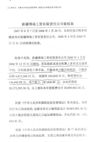 记者注意到,乌鲁木齐地税局官网早在2007年,分别以《乌市一企业连续九年偷税被移送司法机关》、《新疆博瑞工贸有限责任公司偷税案》为标题向社会公布了新疆博瑞工贸有限公司、乌鲁木齐康迅实业有限公司的逃税事实以及处罚决定。认定违法手段恶劣、偷税数额巨大、违法情节严重,依据《中华人民共和国税收征收管理法》第77条和《中华人民共和国刑法》规定,两企业涉嫌偷税已构成犯罪,已将该案件移交司法机关。