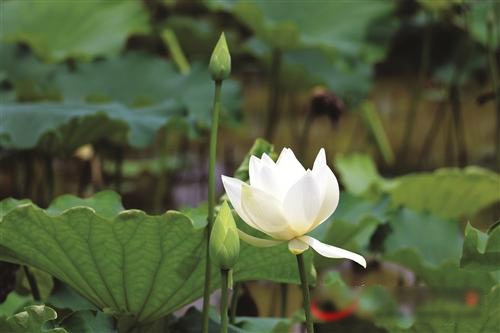 虽然现在的荷花还未进入盛放期,小荷才露尖尖角,但万千红红的尖角点缀在碧绿玉盘中,别有一番风情。
