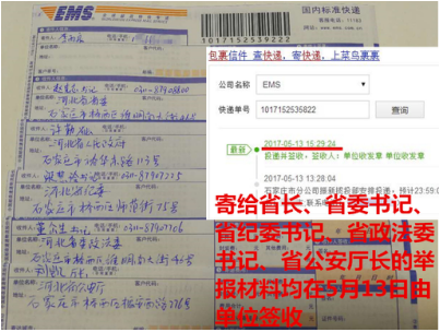 【图解】寄给河北省多名领导的举报材料均于2017年5月13日由该领导所在单位签收,内容为胡瑞新违法违纪的犯罪事实,但至今胡瑞新还逍遥法外。