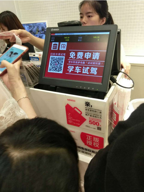 广州多家名创优品的店长都表示,在店铺咨询学车的用户很多,成交学车的消费者也大有人在。因为进了店铺之后就一定会听到或看到人人学车的广告,尽管人人学车暂时知名度不高,但学车这个关键词已经足够吸引到有意向的消费者,基于对名创优品品牌的信任,他们会在店铺主动咨询。即便是现场没有咨询的客户,名创优品在收银台处也安排了收银员进行随袋派发人人学车宣传单张,作为后续传播的一种补充。