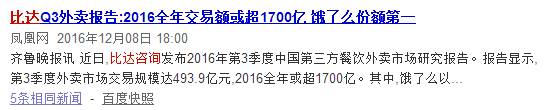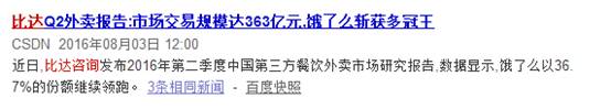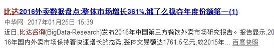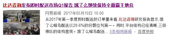 而被虚假报告“坑害”的行业,还远不止共享单车一个。记者在百度新闻中对“比达咨询”的关键词进行搜索,在搜索结果中,比达咨询的另一大金主浮出水面——外卖平台“饿了么”。