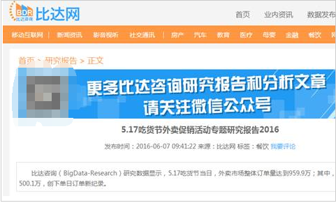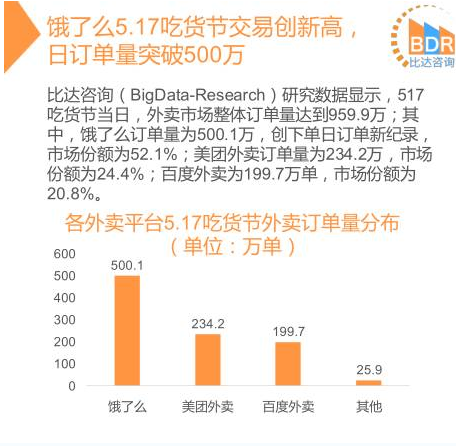 2016年6月,比达咨询还曾发布一份《5.17吃货节外卖促销活动专题研究报告2016》。报告指出,“5.17吃货节当日,外卖市场整体订单量达到959.9万;其中,饿了么订单量为500.1万,创下单日订单新纪录。”
