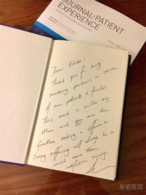 作为国际患者体验协会中国唯一高级会员单位,至道医管在与会期间获得了克利夫兰现任首席体验官Adrienne Boissy 女士的特别题辞:“感谢你们成为我们服务患者及其家属了不起的伙伴,这项事业不同于其他任何事业,你们冲在让世界有所不同的第一线。缓解痛苦永远比满意度调查的内涵丰富得多。”题辞特别强调了患者体验事业远不止患者满意度调查那么简单。