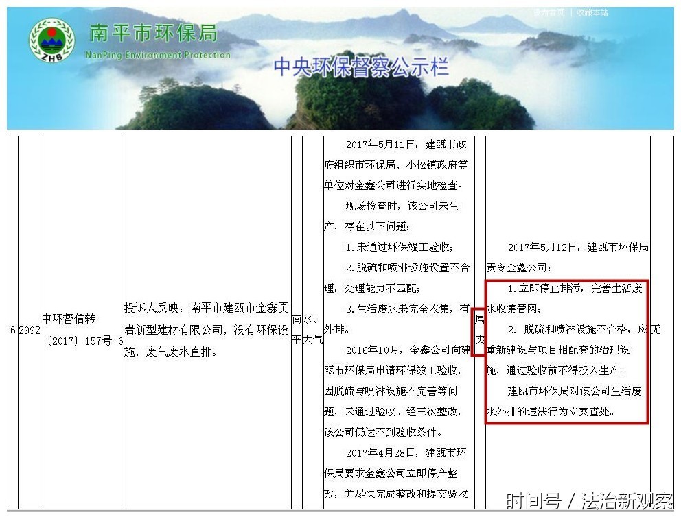 根据中央环保督察组中环督信转〔2017〕157号-6文件公示情况,确认了南平市建瓯市金鑫页岩新型建材有限公司,环保设施不规范,废气废水直排等违法问题属实。2017年5月12日,建瓯市环保局责令金鑫公司:1.立即停止排污,完善生活废水收集管网;2.脱硫和喷淋设施不合格,应重新建设与项目相配套的治理设施,通过验收前不得投入生产。同时,建瓯市环保局对该公司生活废水外排的违法行为立案查处。