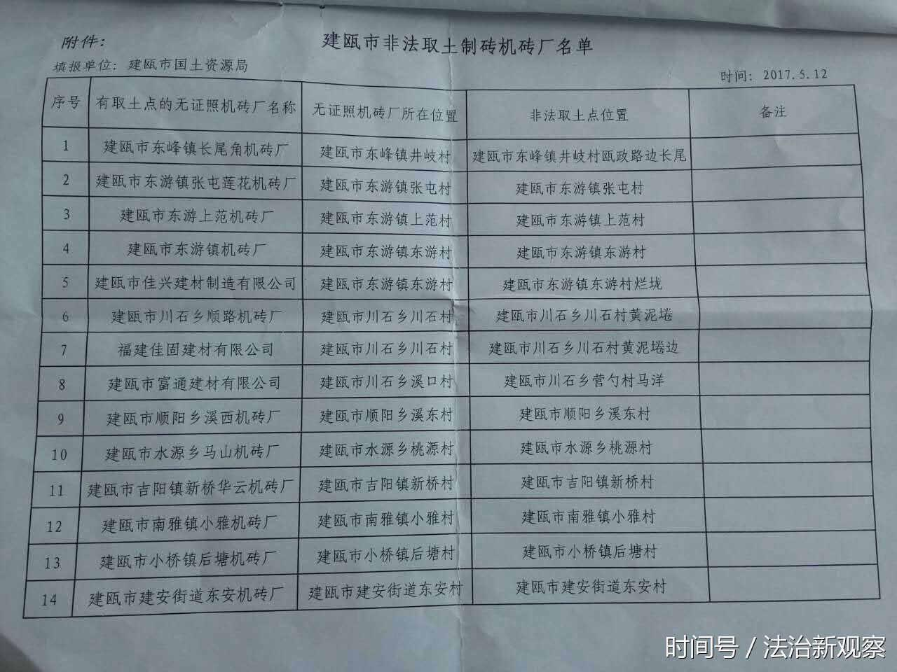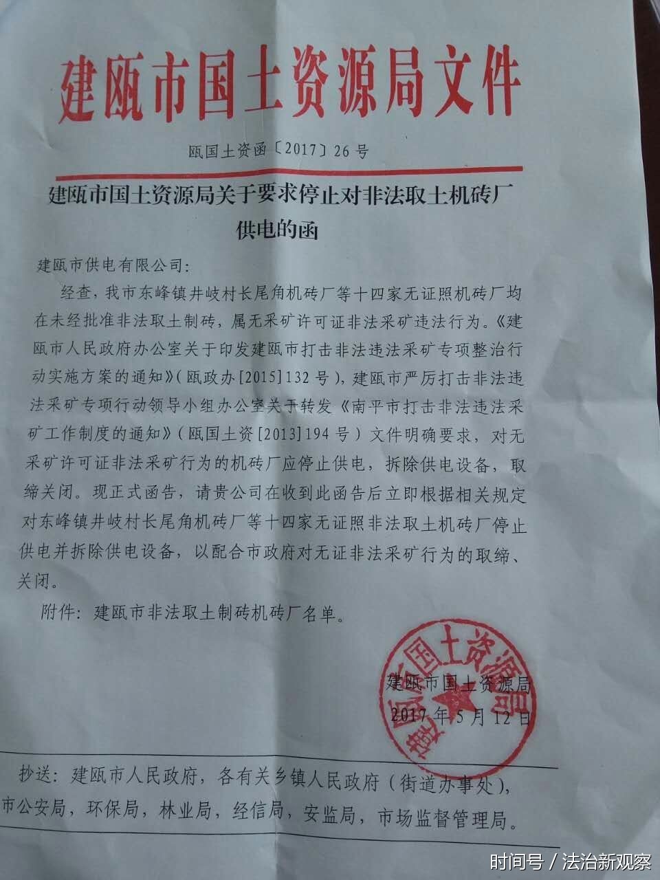 另据建瓯市国土资源局消息,当地多数黑砖厂并没有取得土地使用手续,更没有取土许可证,建瓯市国土资源局于5月12日曾向建瓯市供电公司发函要求停止向非法取土机砖厂供电,(瓯国土资函【2017】26号文件),其中列举了该市14家非法取土机砖厂,并明确要予以取缔。然而时至今日,这些黑砖厂依然在生产。当地群众称,治理黑砖厂首先需要打破利益格局,打掉保护伞。