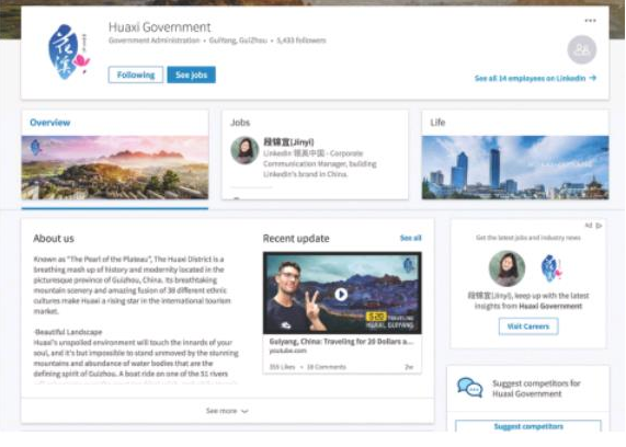 图1: 贵阳市花溪区政府的LinkedIn旅游形象页面截图