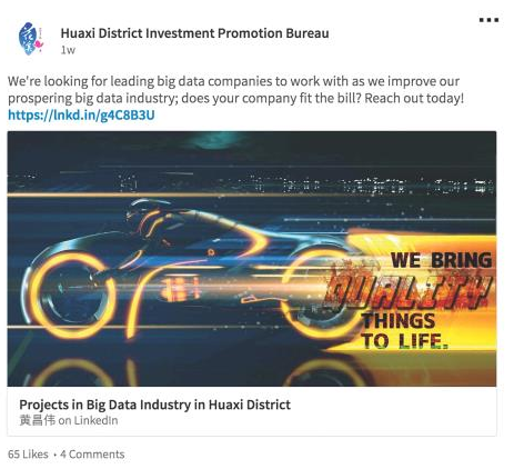 图2: 贵阳市花溪区招商局发布在LinkedIn上的招商引资信息