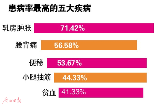 产褥期这些不科学行为也容易导致产褥期疾病的发生和加重。调查显示,1200名产妇最高发的五大疾病分别是乳房肿胀、腰背痛、便秘、小腿抽筋、贫血,而其中乳房肿胀女性更是高达七成以上。