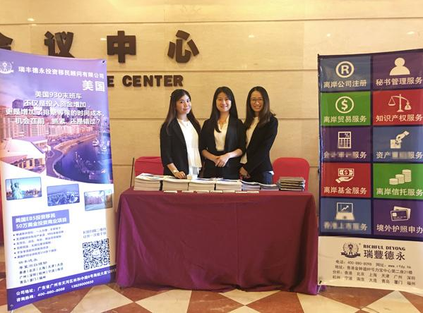 瑞丰德永展位位于签到台对面,吸引了不少客户前来咨询业务,每一位同事对前来咨询的客户热情解答了关于境外公司注册、国际商标、税务筹划等境外商业服务问题。