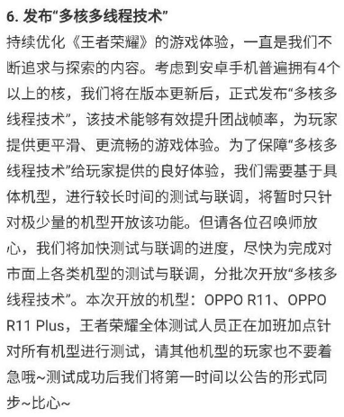 王者荣耀S8赛季蓄势待发,除了新的玩法备受关注之外,技术层面的更新也是万众瞩目。26日,媒体相继曝光了王者荣耀最新的更新日志,日志中称,王者荣耀将在版本更新后正式发布“多核多线程技术”。而首批支持该技术的机型仅为OPPO R11与即将发售的R11 Plus。