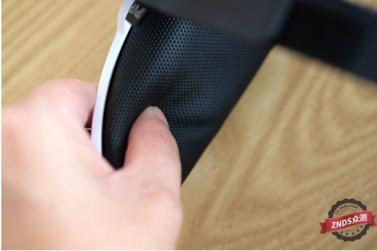大朋VR E3后部特别设计了一个海绵垫,它如同魔术贴一样,粘上去取下来都十分方便。海绵垫表面是亲肤的皮革材质,里面是柔软的记忆海绵,它能够减少托架与后脑勺之间的摩擦,提高佩戴舒适度。