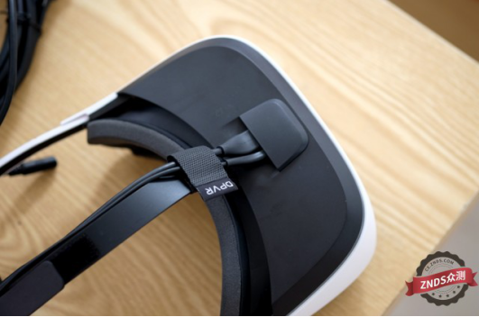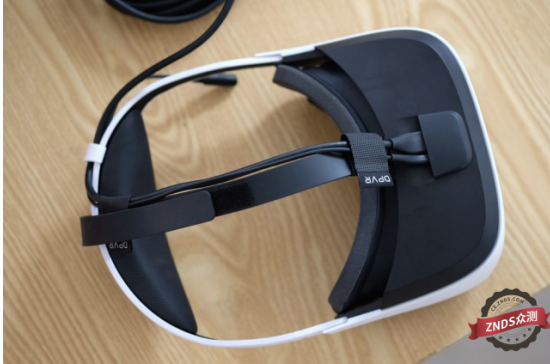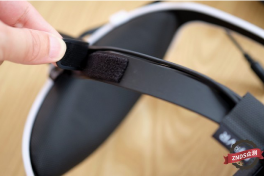 大朋VR E3的三合一线和音频线都位于头盔的上方,为了便于走线和打理,头盔上面还设有一根调节带,三合一线和音频线与调节带通过捆绑带固定了位置,可以避免使用时线材的缠绕。