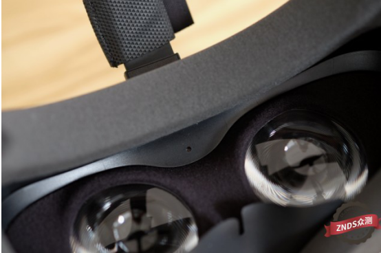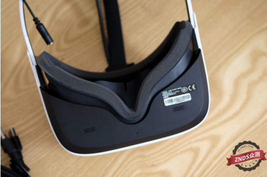 因为结构上与VR一体机不同,所以大朋VR E3整机没有任何一个按键,只有在头盔底部左右各设有散热孔,中间则是内置了麦克风,麦克风在部分VR应用和游戏里可以用来发出语音指令,提高人机的交互体验。此外,从这角度看去,我们也可以发现大朋VR E3眼罩部分使用了亲肤的海绵,海绵比较贴合面部,可以有效阻挡光线对视觉的影响,让沉浸感更强一些。