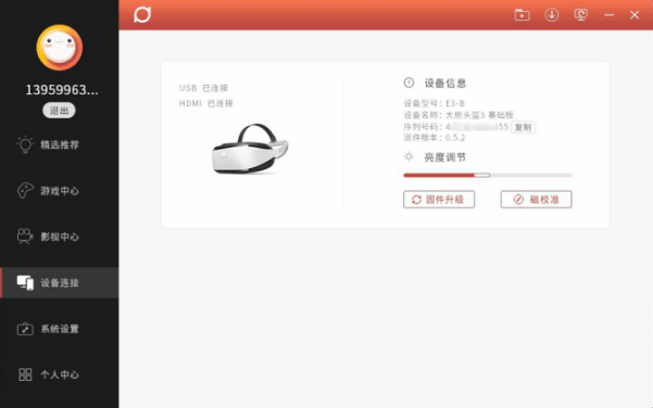 大朋VR E3的固件升级和磁校准都在设备连接菜单里完成,刚拿到机子的时候,固件就更新了一次。当头盔的陀螺仪出现偏差问题,那么就需要磁校对了,它的操作也比较简单,有向导说明。在系统设置目录下可以查看或者修改影视和游戏的保存路径,此外,还可以用来识别电脑配置是否能运行VR游戏。