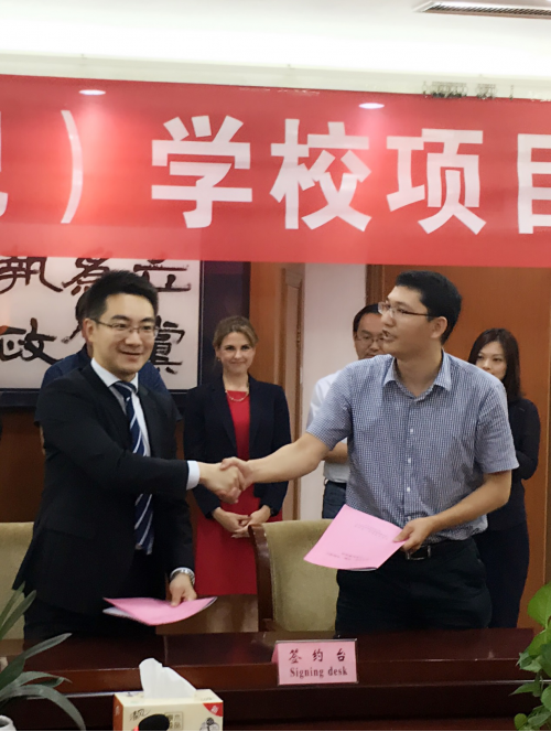 在随后举行的签约仪式上,毅进教育集团总裁高渊奇和瑶海区副区长张一章分别在合约上签字。瑶海区区委副书记黄永宏、英国驻广州总领事馆英式学校业务总监(中国区)温蕾、卡迪夫市议会首席经济发展官肯·普尔、瑶海区区委书记路军、卡迪夫公学英国总校副校长玛丽·肯特、瑶海区区委副书记、区长单虎、英国剑桥国际考试局高级区域经理黄婉虹等共同见证了签约。(见证人顺序从左到右。)