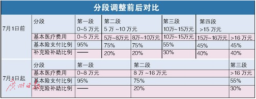 同时,补充医疗保险对住院基本医疗费用分段补助比例也相应进行调整。每次住院发生的起付标准以上部分的基本医疗费用,按以下分段比例计算,在最高支付限额以内支付: