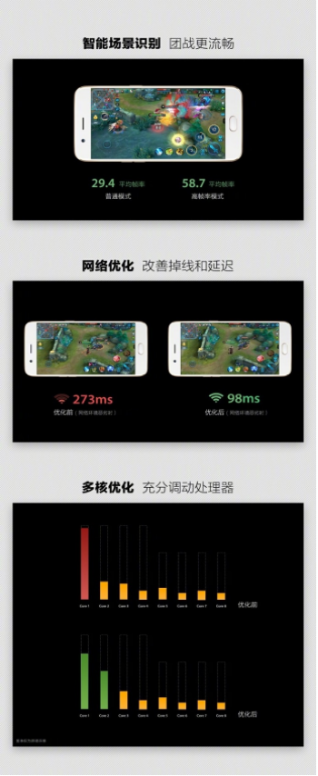 而R11 Plus最大的差异化亮点在于王者荣耀的游戏体验更流畅。上述大屏幕、大内存、大电池为优秀的游戏体验提供了基础保障,而OPPO联合王者荣耀团队调试开发的双核版本则是杀手锏。该版本应用了多核多线程技术,增加了智能场景识别、加强了网络的优化,有效改善了掉线与延迟的情况,并且充分发挥了多核处理器的性能,为玩家提供更平滑、更流畅的游戏体验。