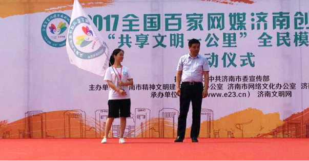 济南市网络文化办公室主任展宝贞现场为采访团代表、来自新华网的记者夏莉娟授旗。除了40家全国重点新闻网站组成的现场报道团,活动还邀请了近60家省内外城市新闻门户网站组成了连线报道团,共计约一百家的报道规模。