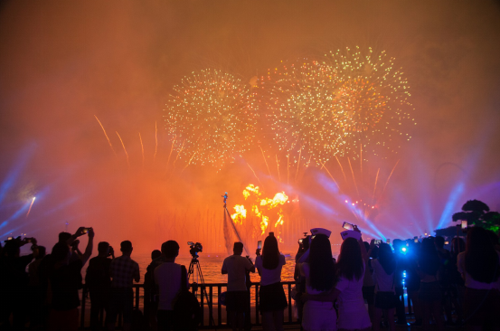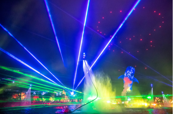 记者现场了解到,幻彩的烟花燃亮整个海洋王国的夜空;喷泉喷射的水柱随着激光光线与音乐舞动,巧妙地变换色彩与姿态;水上飞人团队配合镭射灯以及烟火激光等特效,进行有节奏地升降、翻转表演;摩托艇特技演员更是在焰火中完成一组组超难动作,引来现场观众阵阵的惊呼。