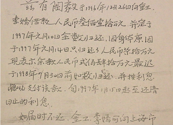 金先生告诉记者,1996年12月底借的钱,原定1997年元月悉数归还,但是陶毅归还了70万之后,就变得拖拖拉拉。没办法,拖了三个月后,我让陶毅给我打了一份《还款计划书》。查阅该书,有如下表述:兹有陶毅于1996年12月26日向金卫、李嫣借款人民币叁佰壹拾万元,并定于1997年元月10日全数归还,因身体原因致归还了柒拾万元,现表示余款最迟1998年7月30日前如数归还,并按利息(双方约定年息24%,当年银行年息为13.96%)支付该款。
