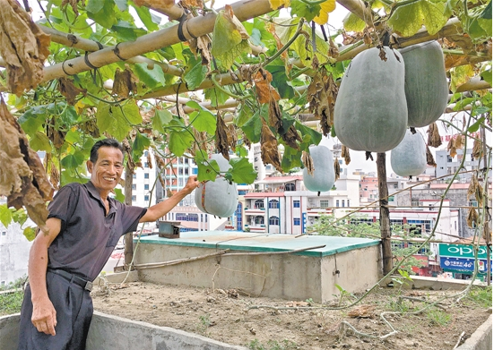 72岁辉叔天台上种出大冬瓜 2017-07-06 16:18:58 莞讯网 72岁辉叔天台上种出大冬瓜 一个不到5平方米的天台,在东莞河田社区72岁的辉叔“折腾”下,几乎每年都能种出上百斤冬瓜。辉叔说,他在这个天台上已经种了10多年冬瓜了,从农历正月开始播种,六月就能收获。天台是辉叔改造过的,虽然地方小,但是“功能大”,不仅能种出大冬瓜,还能收纳上十大桶正在发酵的花生麸。(记者 王俊伟)(来源:羊城晚报) 上一篇:“一呼百应”群防群治6岁迷路女孩找到父亲 下一篇:女子店内盗窃手机 叫的士在店外等候 返回首页