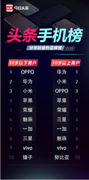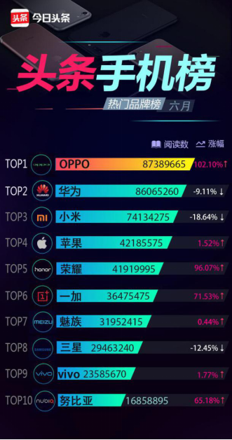 OPPO霸屏头条6月手机榜单排名,抢占多项第一