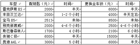 一般来说,配一把新钥匙的所有费用依车型不同约在三百到二千元左右,而完全更新车锁所需的费用有可能是换钥匙的四到五倍,而且配钥匙换锁通常也不在保险公司理赔范围之内,因此费用高。