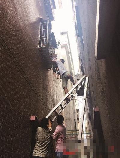 很快,邻居找来了两把梯子,一把梯子搭上一楼窗户,另一把梯子则搭在一楼窗户和巷道对面的墙,通过这种方式才能够到二楼窗户的男童,并将其托起。梯子显得不太牢固,张威却爬上了梯子。