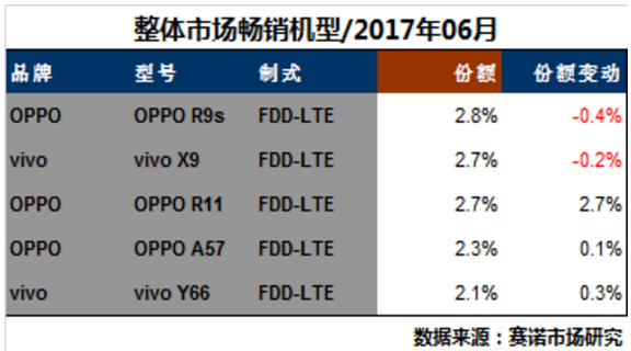 在6月份线下市场排名前5的畅销机型中,OPPO抢占了其中3款,分别是OPPO R9s、R11以及A57,从份额变动来看,OPPO R11的上市成功挤占了其它几款机型较大的市场份额。