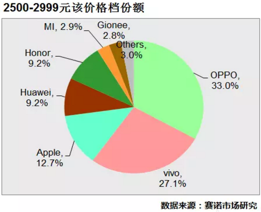 在2500-2999元的价位段中,OPPO凭借33%的份额占据第一位,这是OPPO连续12个月取得线下市场份额第一。