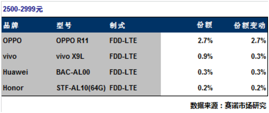 其中,在2500-2999元价位档中,OPPO R11份额高达2.7%,位居第一位,首战告捷。