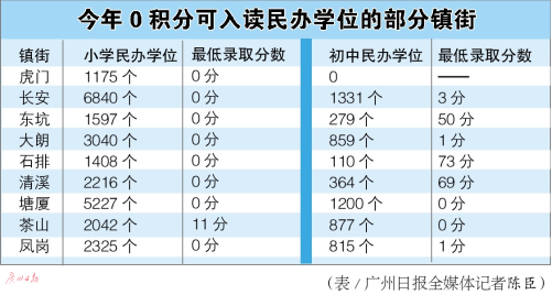 哪些镇街可以0积分入读民办学位呢?记者搜集信息统计发现,全市共有长安、虎门、大朗、东坑、塘厦、清溪、凤岗、茶山、石排9个镇出现0积分也能获得民办补贴学位的申请人。其中,除了茶山0积分获民办学位是初中学位外,其余镇街小学学位均有0积分获得者。
