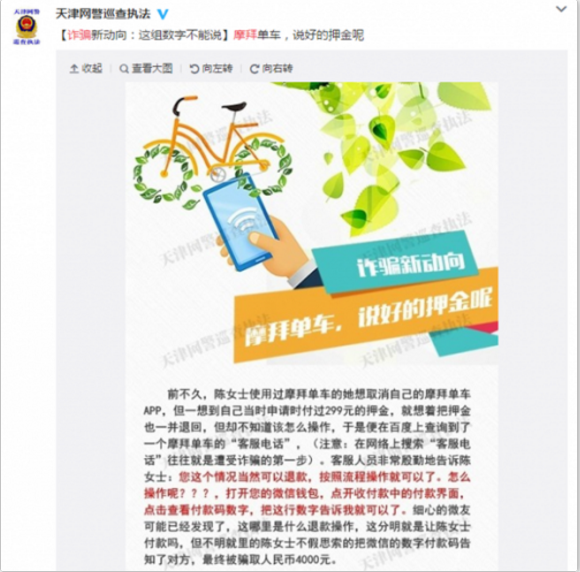 近日,天津网警一条预访诈骗的微博引起笔者注意,文中提到冒充共享单车尤其是摩拜单车客服人员,以退还押金为由实施的诈骗案件呈多发趋势。这条微博点名摩拜质问押金问题,提醒网友识破诈骗陷阱。业内人士指出,物必先腐而后虫生,正是摩拜客服处理退款时高冷的态度,给了骗子可乘之机。后者苦心设计温柔的陷阱,利用不厌其烦的“五星级”服务态度,将投诉无门的摩拜用户引进圈套。