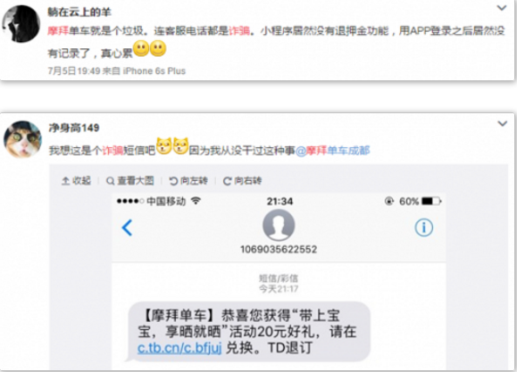 陈女士与李先生的遭遇并非个案。据台海网7月19日报道,厦门市民小海想退摩拜单车押金,不料押金没退成,却被骗走9588元。此前,安徽姑娘小杨被摩拜“客服”诈骗近3000元,也曾在社交媒体上引起广泛热议。微博用户“净身高149”晒图质疑,摩拜群发的垃圾短信包含虚假的中奖信息。