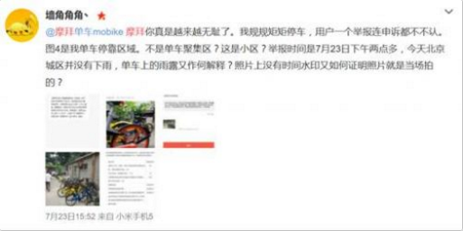7月23日,一位名为“墙角角角“用户在微博投诉:摩拜你真是越来越无耻了。我规规矩矩停车,用户一个举报连申诉都不认。