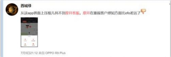 7月5日,用户“西城绿”投诉称:从这app界面上压根儿找不到摩拜客服,摩拜在重视客服感知方面比ofo差远了。